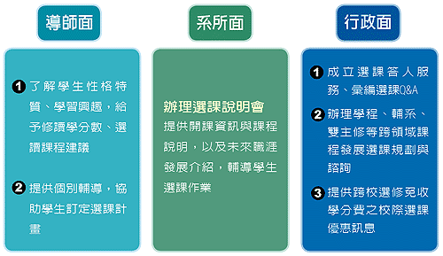 系所輔導:系所辦理選課說明會,落實選課輔導功能。 |